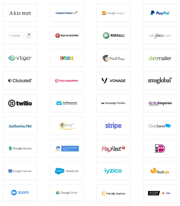 Collage van ondersteunde betaalmethoden, platforms, OS & CMS: iDEAL, Mastercard, Visa, Klarna, PayPal, Google Maps, Windows, Apple en Joomla