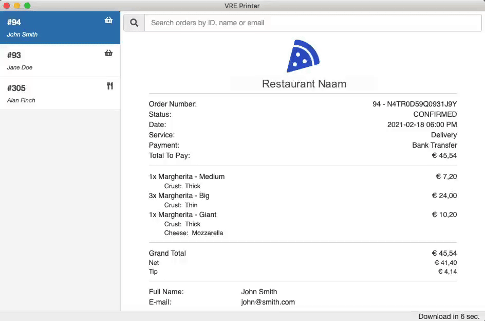 As soon as an order comes in via the website, it prints automatically and flawlessly on your own thermal receipt printer.